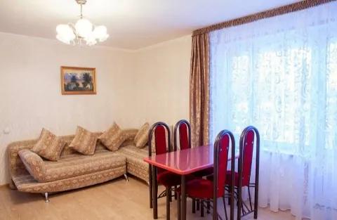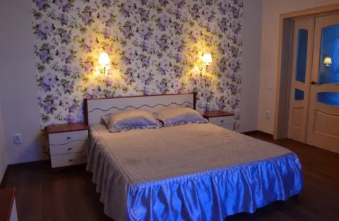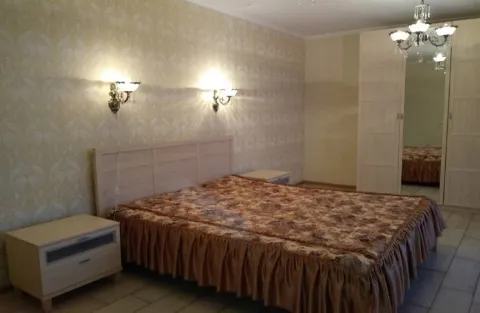 В спальне размещен спальный гарнитур: большая 2-х спальная кровать, шкаф для белья, 2, комод с зеркалом. В номере есть электрочайник, набор посуды