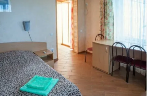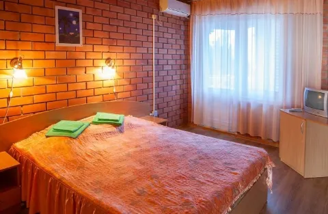 В каждом номере прихожая, спальня, ванная комната,большая кровать, шкаф для белья, стол со стульями, чайник, набор посуды, холодильник, кондиционер, ТВ. Площадь номера 13 - 15 кв. м.